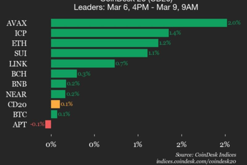 CoinDesk 20 Performance Update: Avalanche (AVAX) Gains 2% as Index Trades Flat