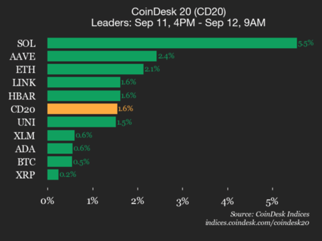 Leaders: SOL (+5.5%) and AAVE (+2.4%).