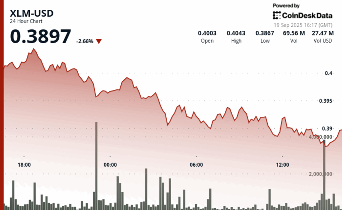 Stellar’s XLM token slipped below key support in a bout of institutional selling, signaling broader market weakness. Between Sept. 18 at 15:00 and Sept. 19 at 14:00, XLM fell 3.58% from $0.40 to $0.39, with volumes surpassing the 24-hour average of 22.33 million tokens. Analysts pointed to concentrated selling during overnight sessions — traditionally dominated by institutional flows — and the breach of $0.40 support as evidence of repositioning ahead of regulatory clarity.