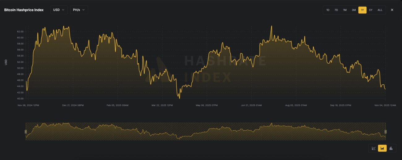 Hashprice drops to $43.1 PH/s as bitcoin’s price correction, low fees and record hash rate squeeze miners’ margins.