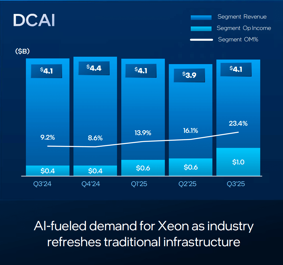 On a yearly basis, DCAI revenue is just below being flat, with the $4.1b in quarterly revenue marking a 1% decrease over Q3’24. Otherwise on a quarterly basis, revenue has increased by 4.5%.