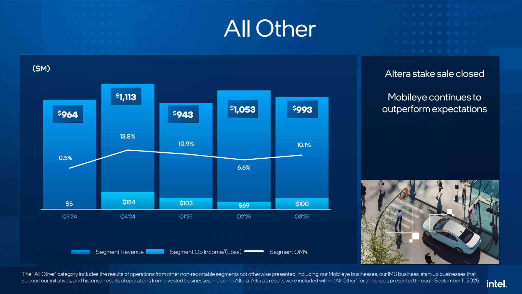By the numbers, for the most recent quarter the All Others business unit booked $993m in revenue, which is up 3% YoY and down 6% QoQ. Of that revenue, $386m came from Altera for the 10 weeks it was still part of Intel. Meanwhile operating income for the quarter was $100m, which is up massively versus Q3’24, but is roughly average with the business unit’s operating income over the past four quarters.