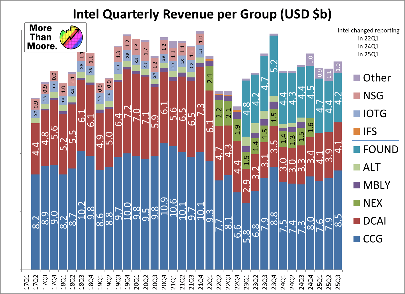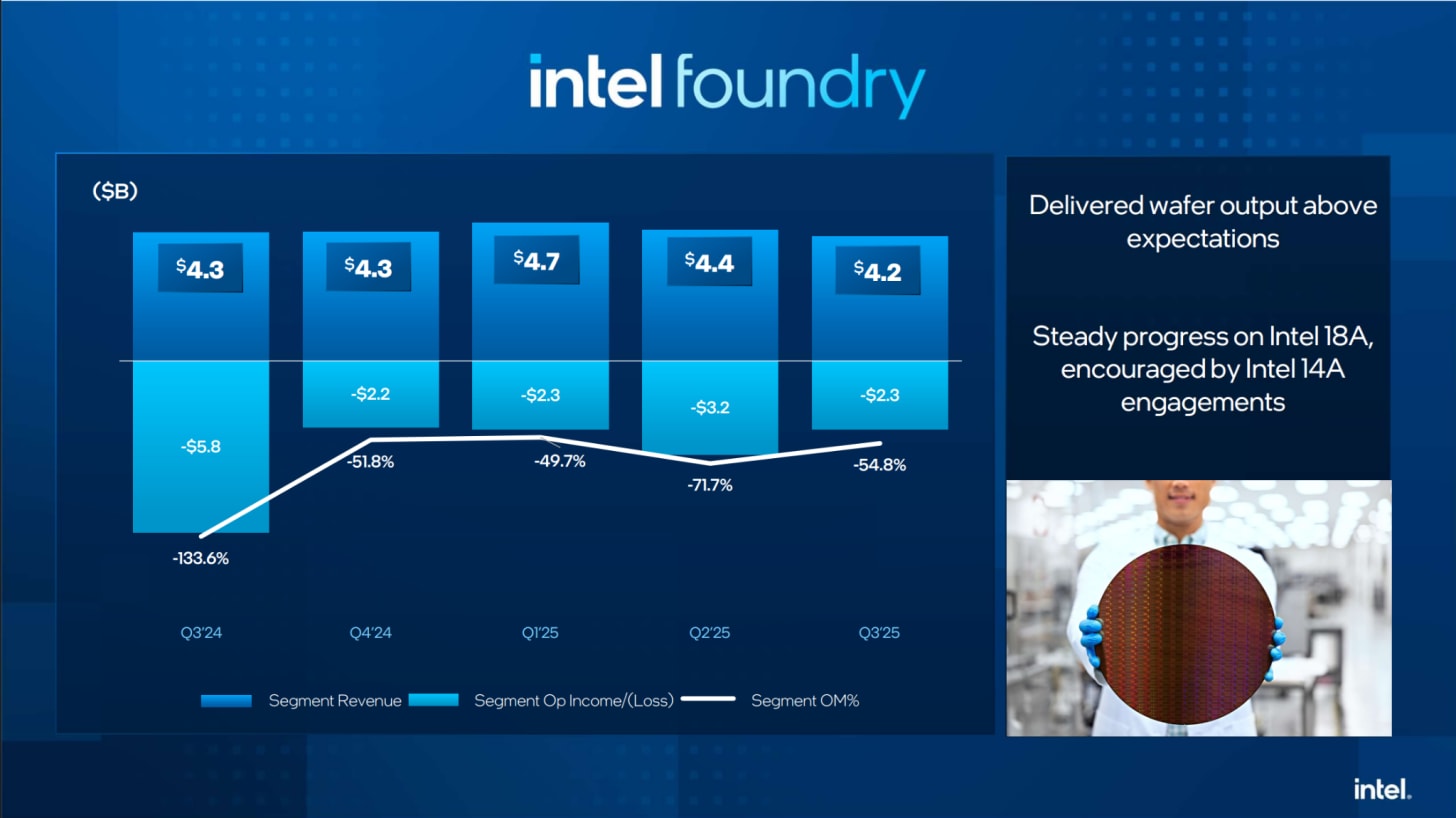 For the most recent quarter, Foundry’s performance has recovered after a dip in Q2 due to a write-down in fab assets. As a result, Foundry’s $4.2b of operating revenue and $2.3b operating loss for Q3’25 is a perfectly average quarter for the business from a financial perspective. As a reminder, Intel isn’t expecting the foundry business to turn break even for a while, and finally become profitable by the end of the decade.