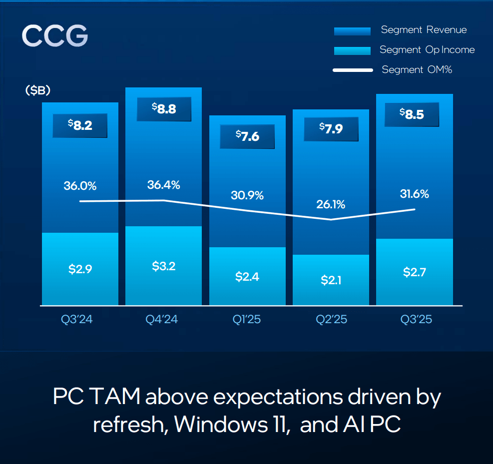 Past this, Intel is also the beneficiary of the (first) retirement of Windows 10, which has seen Microsoft drop support for chips older than Intel’s 8th Generation Core (Coffee Lake) processors. As a result, the PC industry as a whole has seen PC sales pick up as older systems are retried and replaced with Windows 11-compatible gear. Intel is also citing interest in AI PCs as a contributing factor to the growth of the CCG business, though the company isn’t providing any detailed guidance on revenue share or the number of AI PC (Meteor/Lunar/Arrow Lake) chips they’ve sold.
