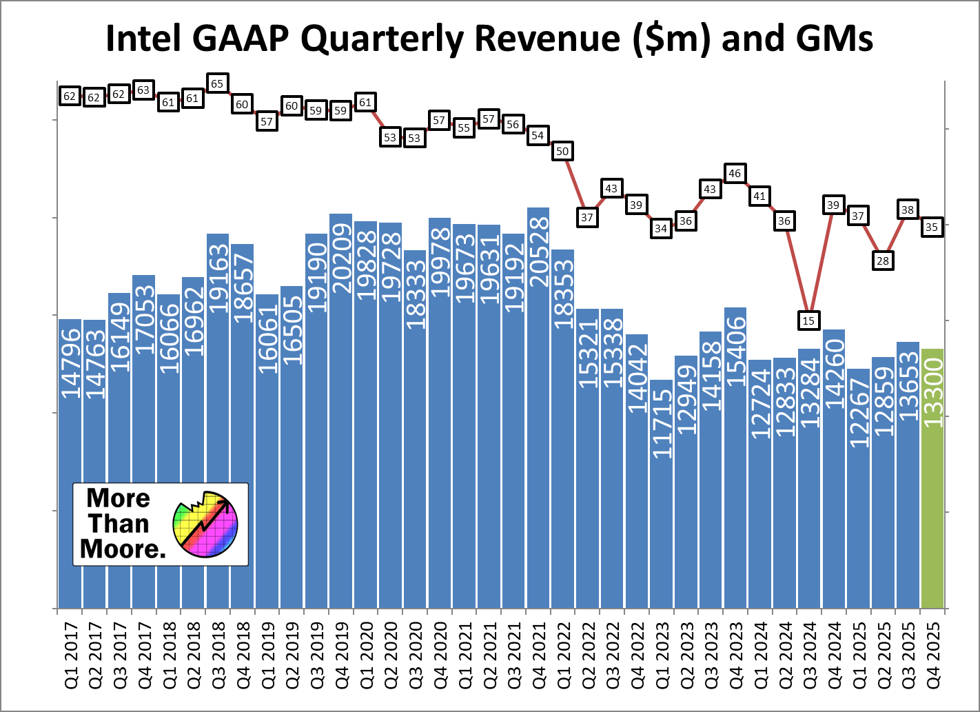As for gross margins, both GAAP and non-GAAP margins are forecast to decline slightly as well. Q4’24 was a relatively strong quarter for Intel when looking at the last several quarters, so its 39% GM is a bit hard to catch up to; at this point Intel is just trying to hold things steady amidst the launch of Panther Lake, whose initial ramp-up will impact Intel’s margins.