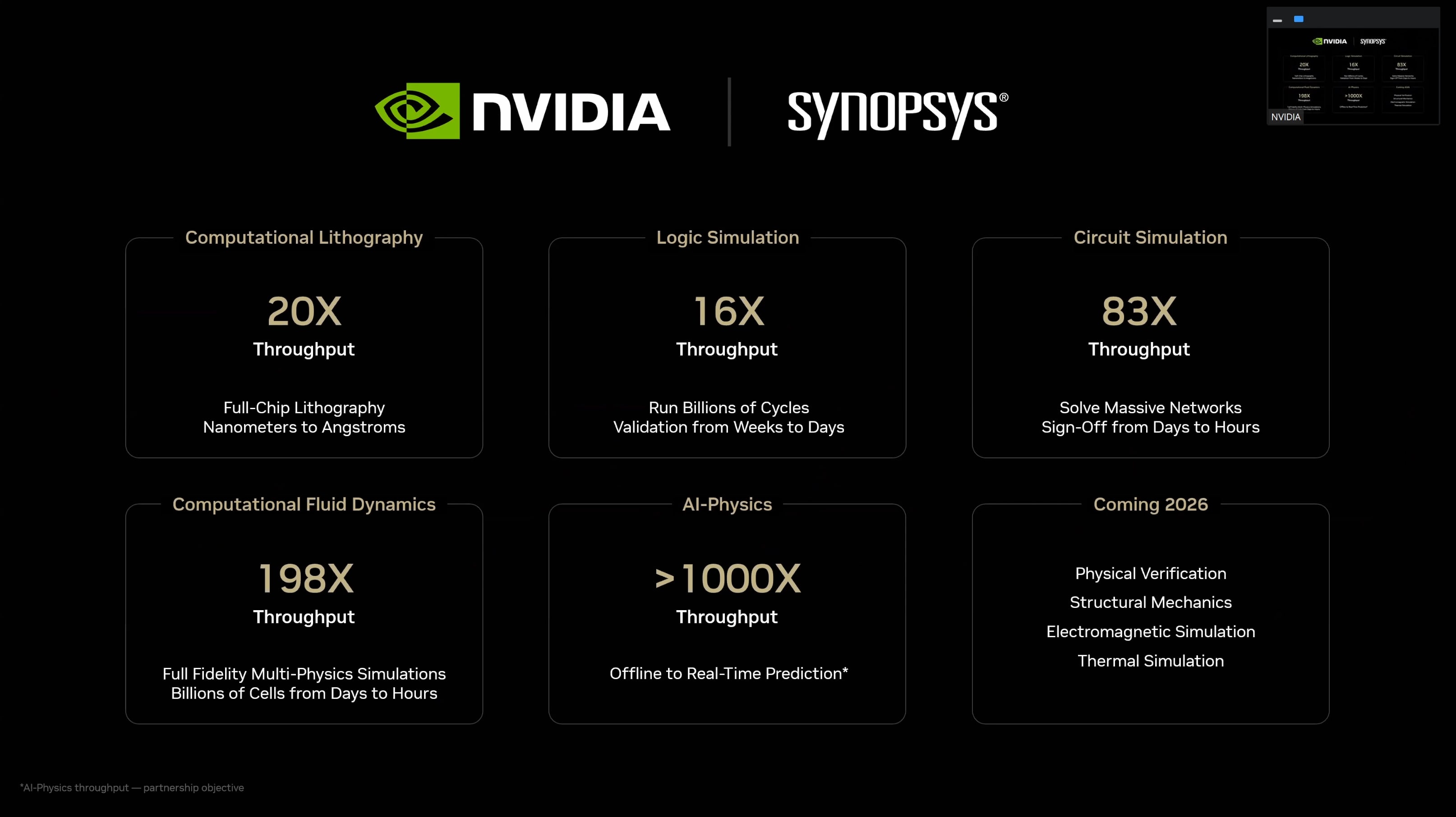Neither company put an exact number on this shift, and both avoided any forward TAM sizing. But the implication is that if even a modest portion of aerospace, automotive, energy or industrial engineering begins adopting virtual first workflows, the aggregate demand for accelerated simulation could grow significantly. As the lead, Synopsys gains revenue, and as an investor and hardware supplier, NVIDIA grows too.