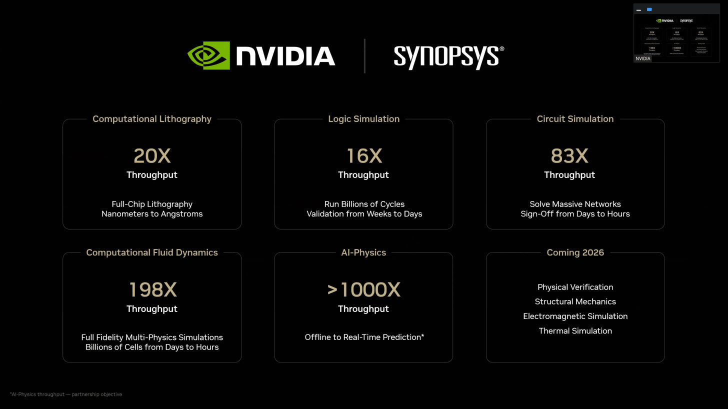 A clear question raised in both Q&A sessions was how much of Synopsys’ portfolio is already GPU native, and how much still requires deep rewriting. The CEOs acknowledged that several workloads already use GPUs, but that the largest simulation time reductions come only after algorithms are reformulated. Jensen noted that “twenty plus” applications have some level of acceleration today, but that the multi physics and electromagnetic workflows require more structural change before they deliver the expected uplift. The companies did not provide dates, but the cadence implied a multi year migration through 2026 and 2027.