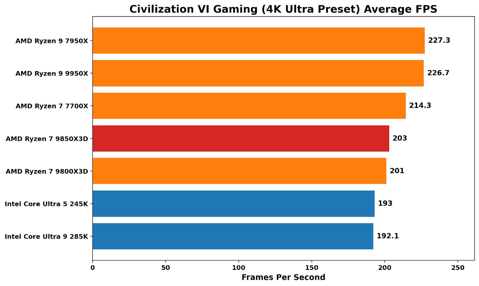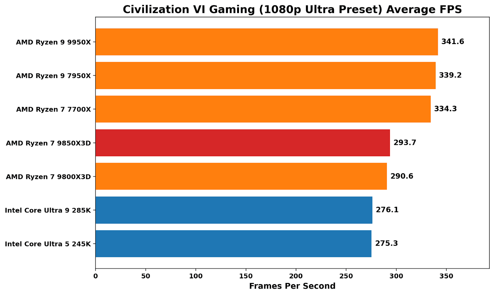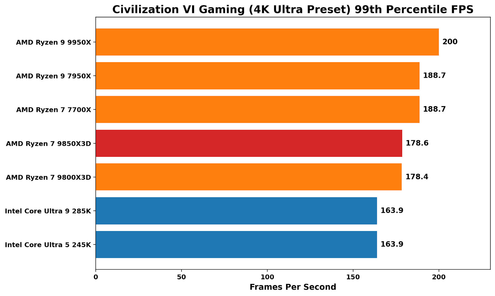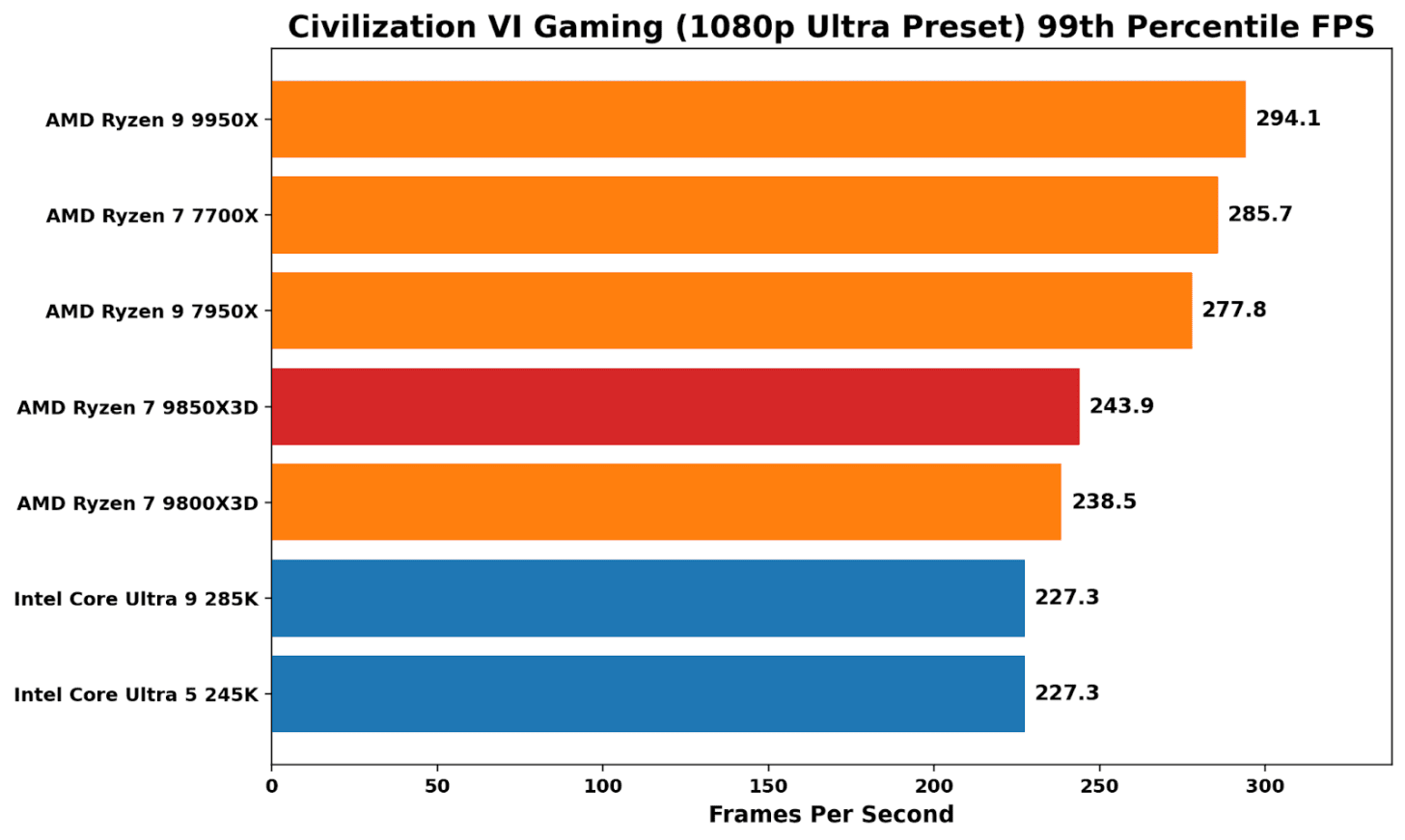 Benchmarking Civilization VI at 1080p Ultra is a good reminder that X3D isn’t an automatic win in all things gaming. The non-X3D Ryzen parts sit at the top, with a noticeable performance advantage over Intel’s Arrow Lake pairing. Comparing the two Ryzen 7 Zen 5-based X3D parts, the 9850X3D is under 1% faster than the 9800X3D. We saw better 99th-percentile performance on the X3D, with the additional frequency giving a small boost on the 9850X3D.