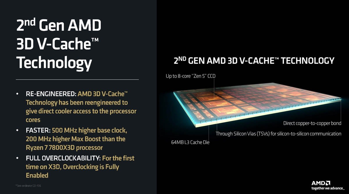 X3D is a physical technology – it’s a design crafted by packaging an extra slab of SRAM onto the compute chip, so a workset has more room to stretch before it trickles over into the DRAM. Compared to previous generation AMD X3D designs, such as the Ryzen 7 5800X3D, AMD has flipped the order of the two chips in the package, placing the cache on the underside of the compute die. This means the hot cores are at the top, and can dump heat into the heatspreader or IHS more effectively. That’s pretty much the real reason AMD can effectively bump up clock speeds without changing the fundamentals of X3D and its packaging. It does have added complexity though. You can find out more by watching our video here: