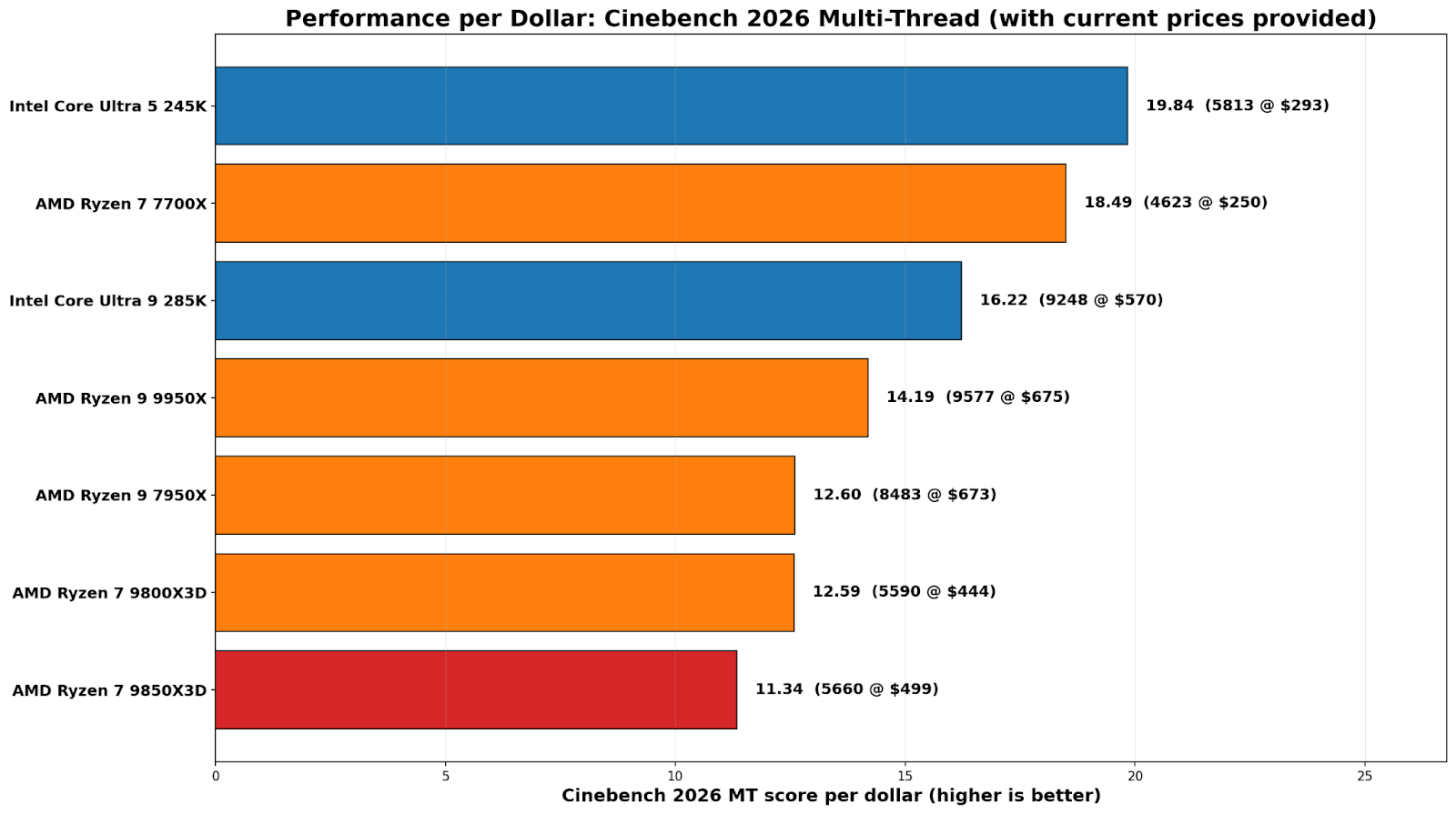 The most relevant comparison in this section is between the two 8-core X3D parts. The 9800X3D works out at 12.59 (5590 for $444), and the 9850X3D slips to 11.34 (5660 for $499). Same takeaway as the efficiency charts: you’re paying extra for a marginal bump, and on multi-threaded performance per dollar, the 9850X3D is simply the weaker buy right now.