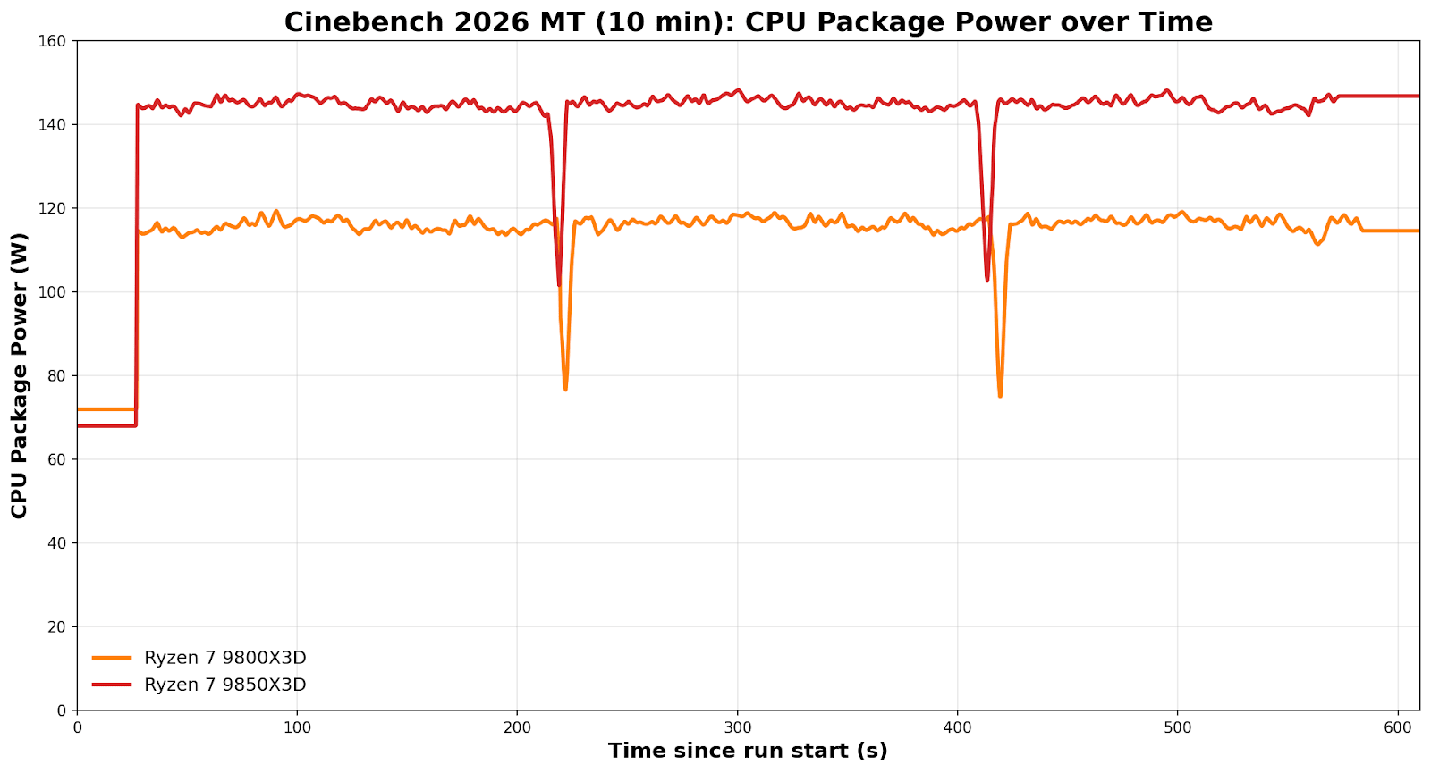 Now this looks somewhat absurd on the face of it. But the reality is, even within these chips, we don’t know if we have a ‘good version’ of one and a ‘bad version’ of the other. It’s something other testers are also seeing – some have larger power differences, others have next to zero. But on this data alone, it would imply that the Ryzen 7 9850X3D is around 18% less efficient in Cinebench 2026 MT under a sustained CPU-only, non-cache heavy workload. The behavior that differentiates the chips is exactly what we would expect to see from a higher-binned SKU under an all-core load.