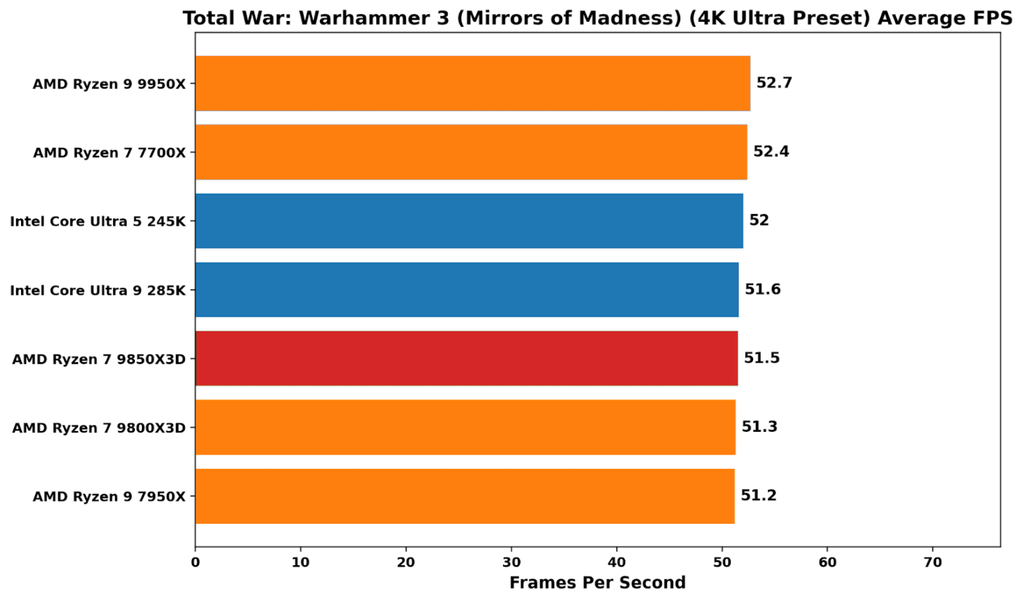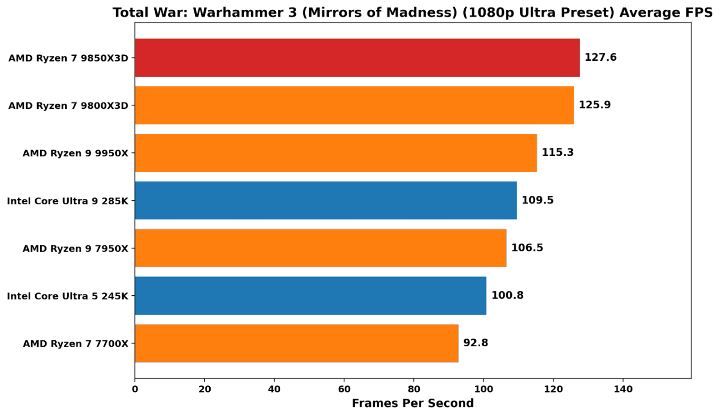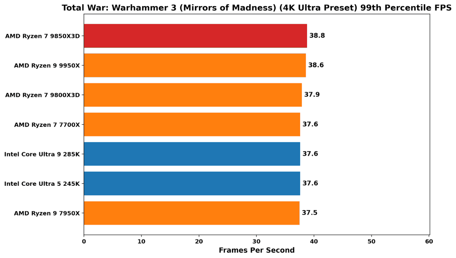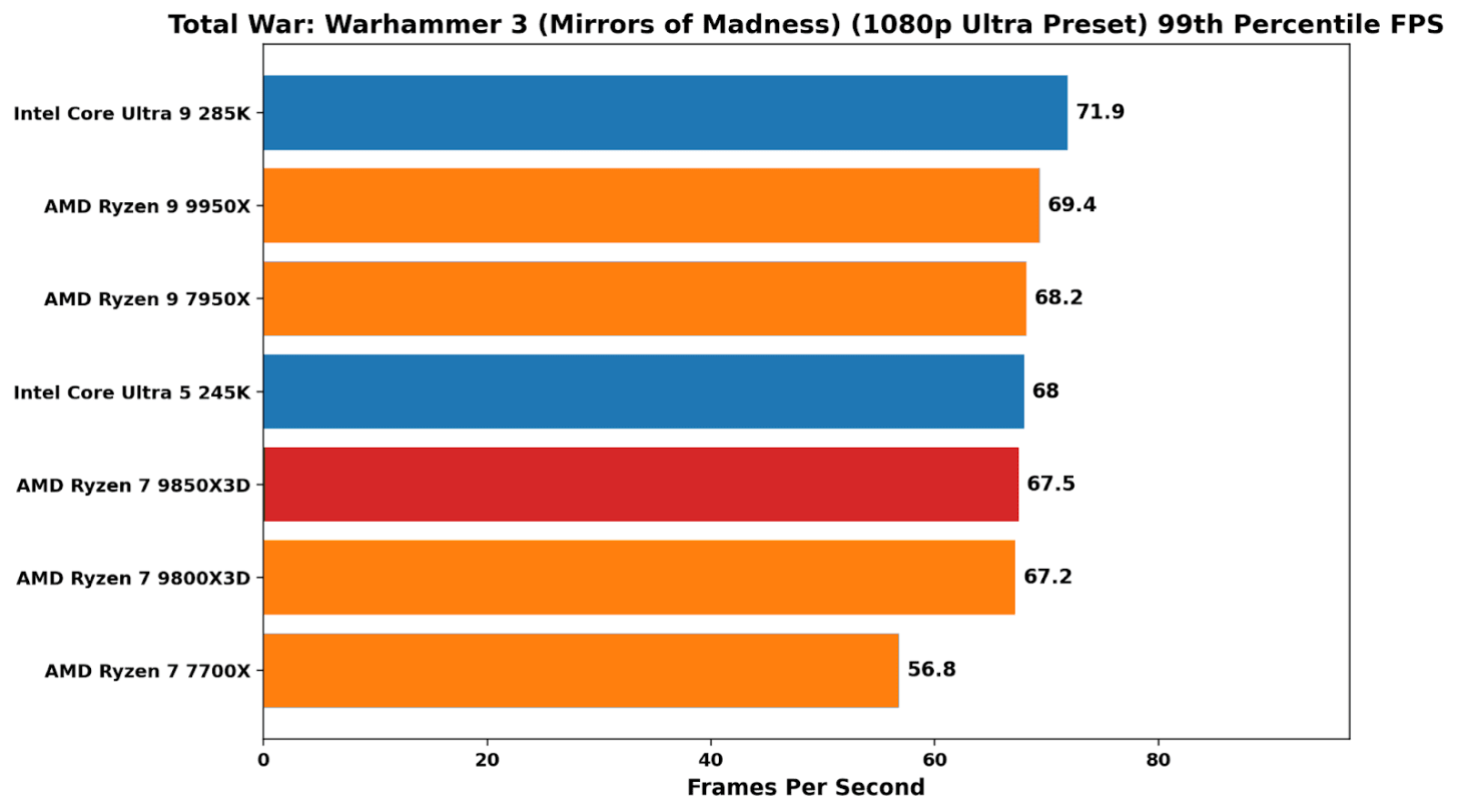 In Total War: Warhammer 3, the X3D peaks again demonstrate their value in kind, with a sprawling, simulation-heavy workload that places heavy cache pressure on the system. At 1080p, both the 9850X3D and 9800X3D sit clearly ahead of the pack, with better average performance than the 9950X and around 15-18% ahead of Intel’s Arrow Lake parts. In 99th percentile performance, things weren’t as peachy as average frame rates, although still up there with the other chips on test (bar the 7700X, which lags behind pretty much consistently in overall performance).