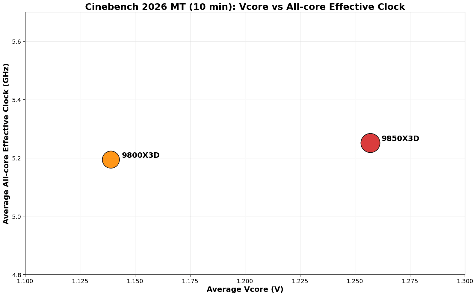My aim here is to show how the chips behave under sustained load, what voltage and power it takes to maintain the all-core frequency, and whether the extra performance is efficient or just expensive. Using matched 10-minute Cinebench 2026 multi-thread runs, the charts below focus on the deltas between the 9850X3D and 9800X3D in power, Vcore, clocks, and temperature, and what that means for performance-per-watt.