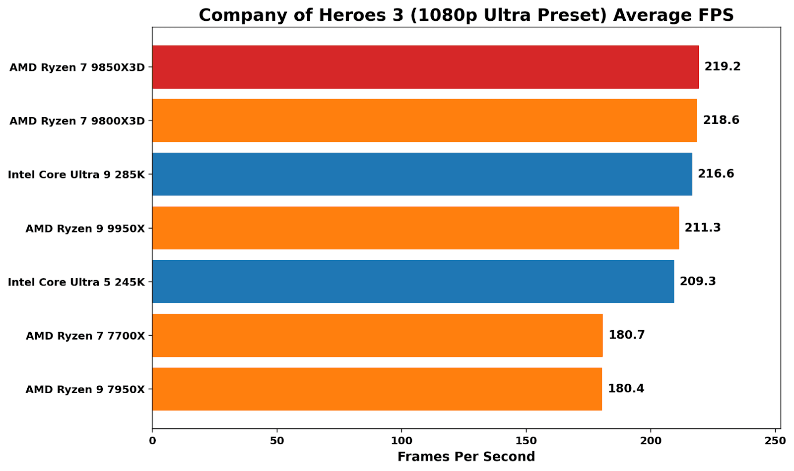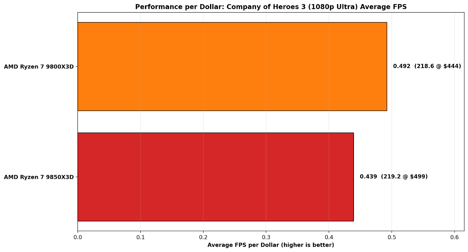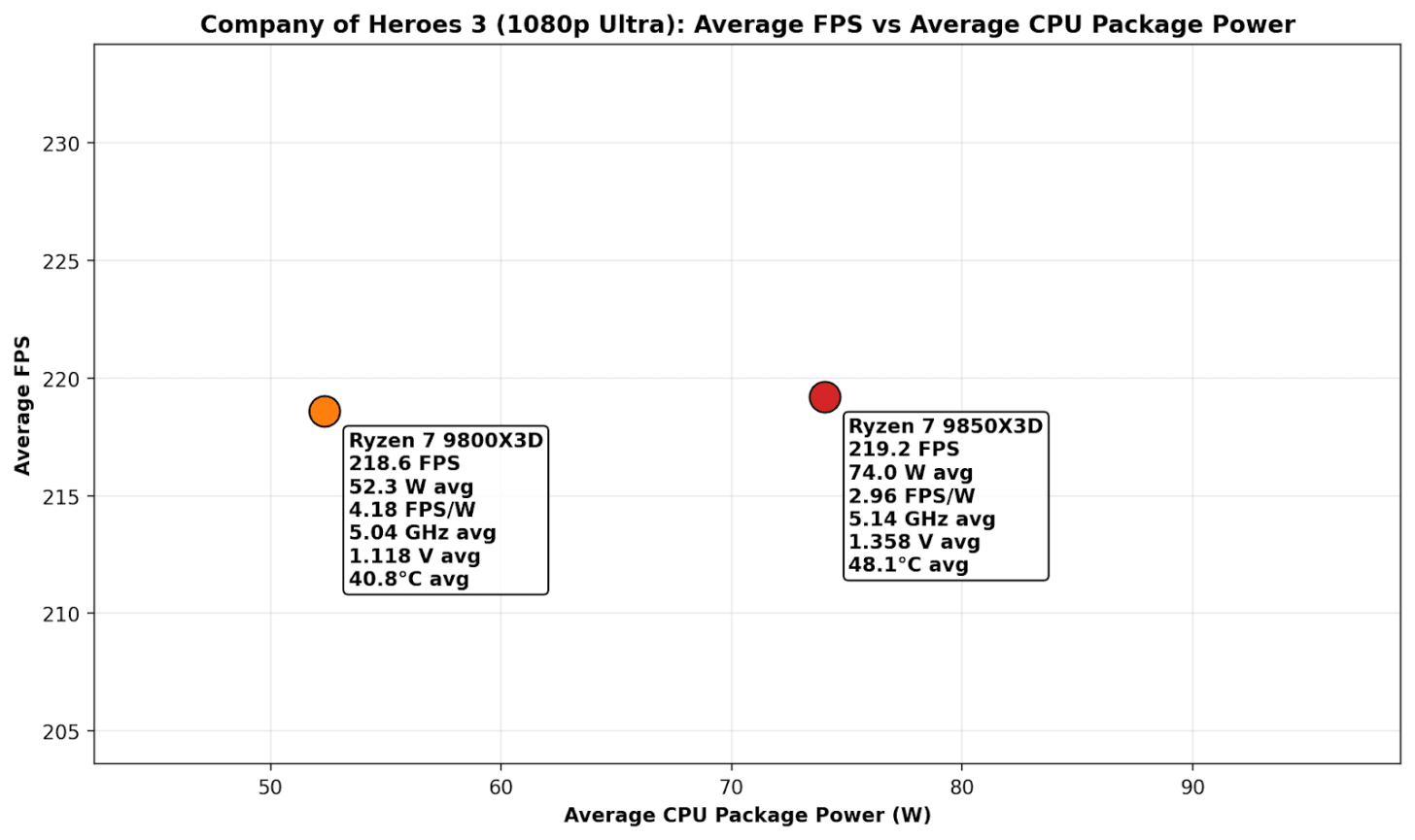 On Company of Heroes 3 at 1080p Ultra, the performance-per-dollar picture is even more one-sided because the actual FPS result is basically a tie. The 9800X3D posts 218.6 FPS at $444, which works out to 0.492 FPS per dollar, while the 9850X3D manages 219.2 FPS at $499, or 0.439 FPS per dollar. That tiny 0.6 FPS advantage doesn’t come close to justifying the price bump, which leaves the 9800X3D at roughly a 12% better value in this specific game test.