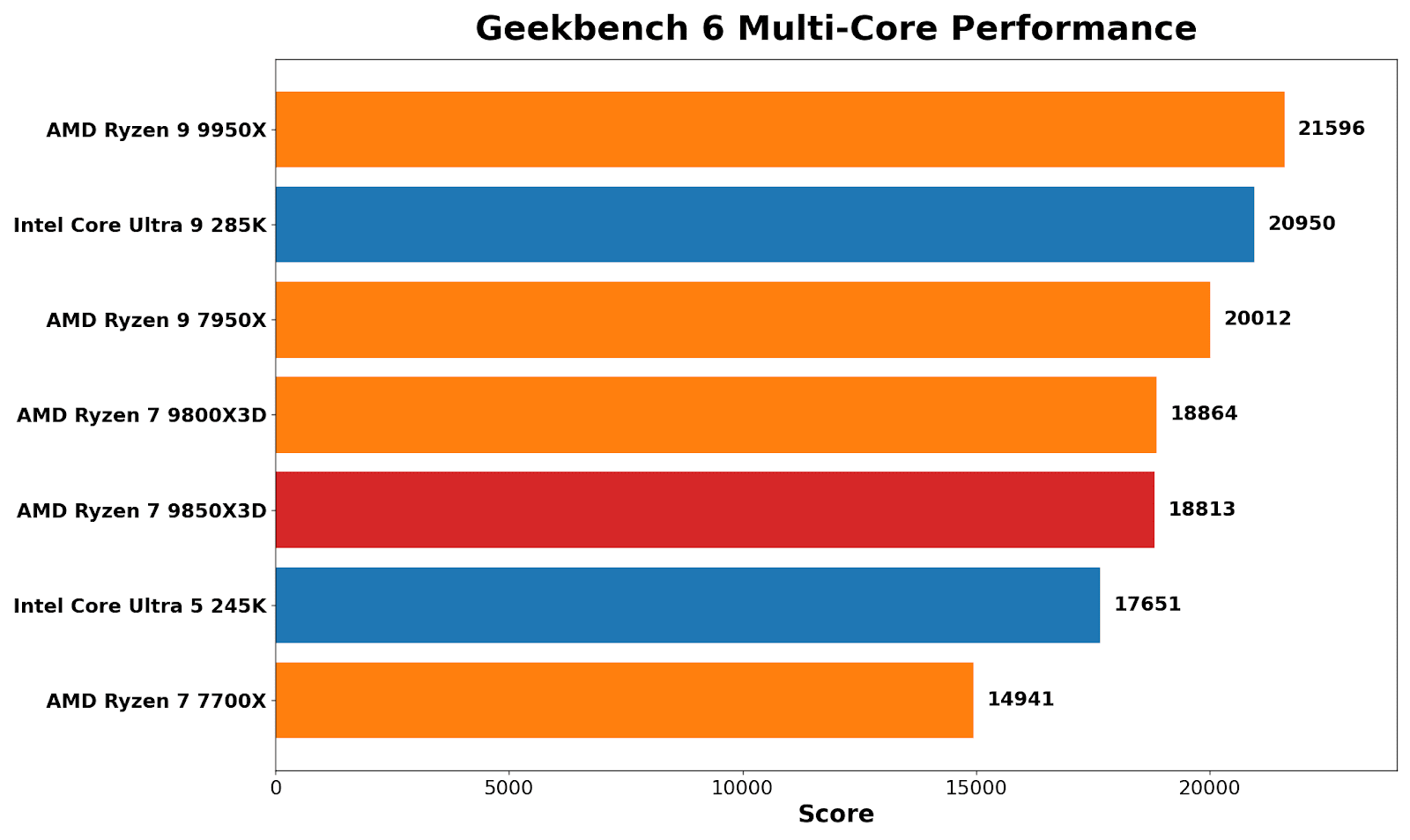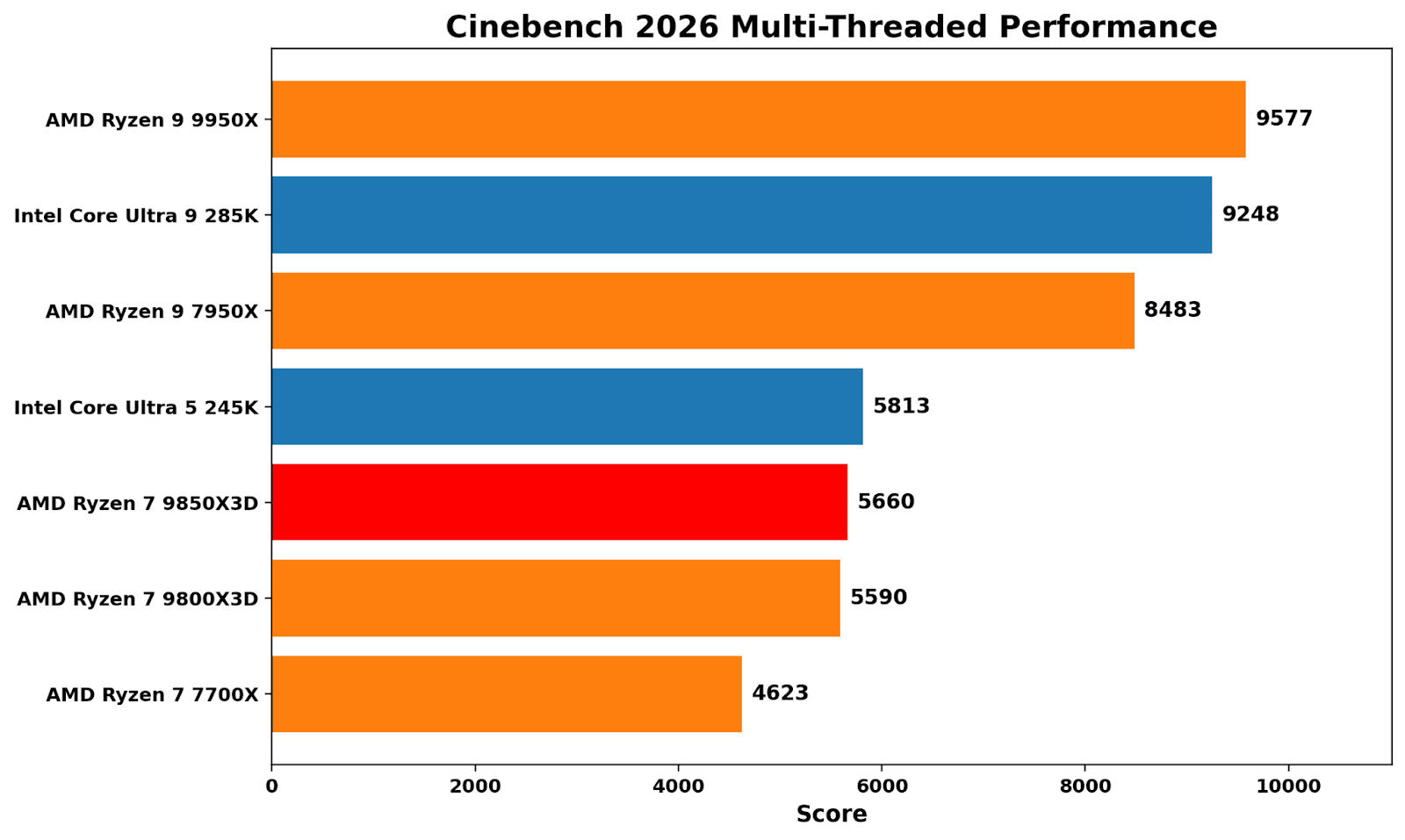 On a straight score-per-dollar basis, the Core Ultra 5 245K is the value standout here at 19.84 points per dollar (5813 for $293). The Ryzen 7 7700X isn’t far behind at 18.49 (4623 for $250). From there, it drops off pretty quickly once you climb into the high end, where you’re paying a lot more for smaller gains. The Core Ultra 9 285K comes in at 16.22, while the Ryzen 9 9950X lands at 14.19.