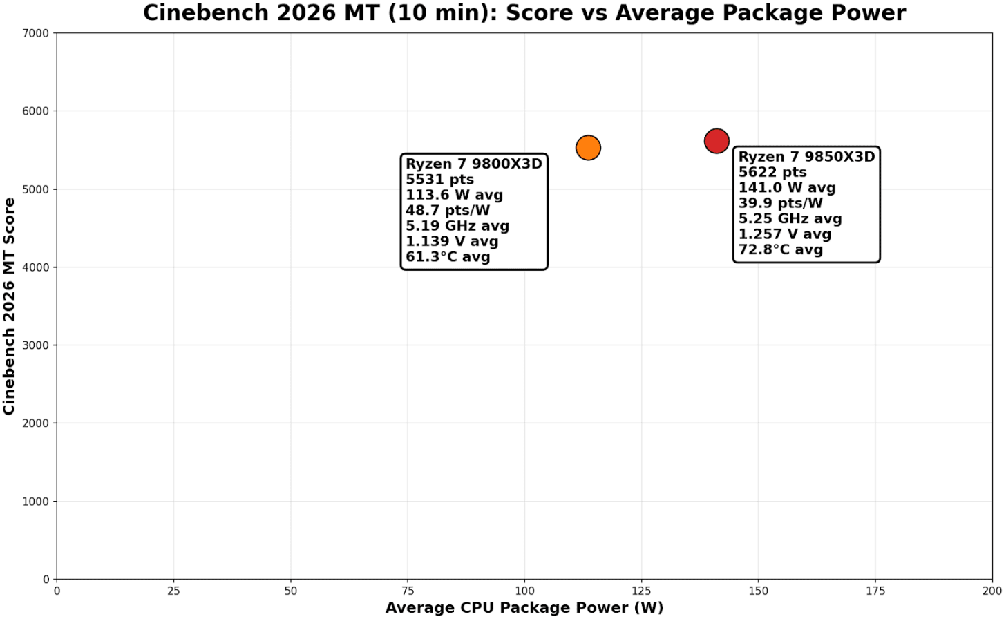 Operating at a higher CPU VCore effectively means two things: it draws more power at the package level and runs hotter. The extra 27.4 W drawn by the higher-binned 9850X3D yields only an additional 91 points in Cinebench 2026 MT, at the cost of running around 11°C hotter.