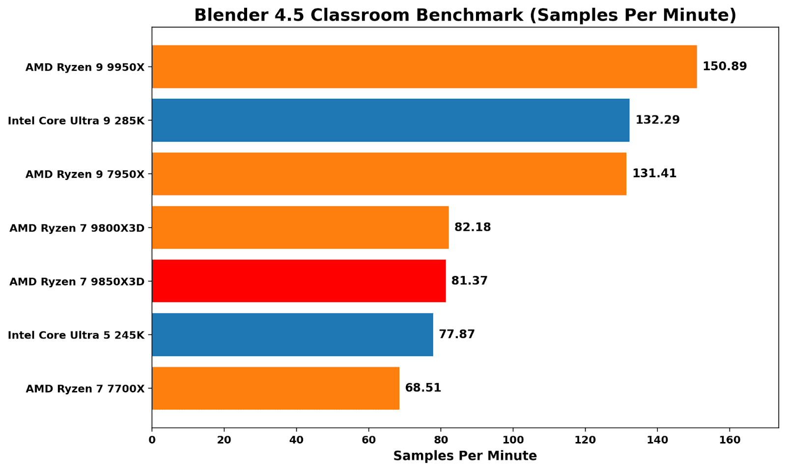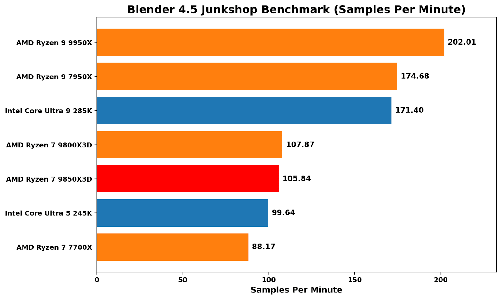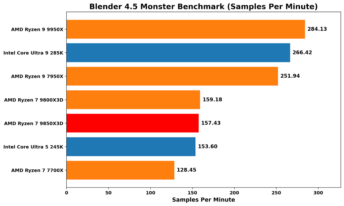 Blender 4.5 is more about pure throughput than anything else, and it treats the X3D chips in an unbiased fashion; performance between the 9850X3D and 9800X3D is virtually identical. It’s another way of saying that stacking L3 cache doesn’t help in pure grunt and rendering throughput.