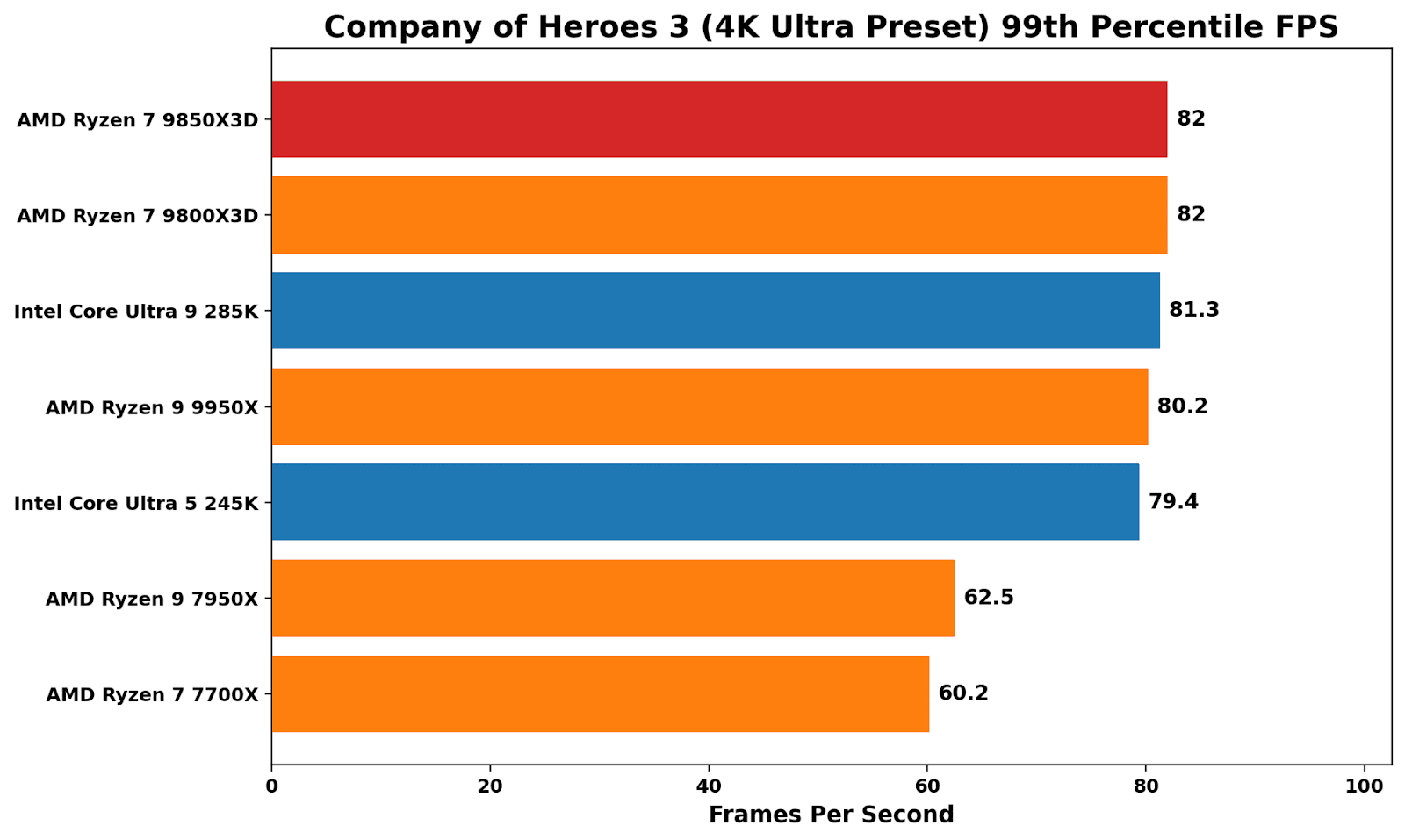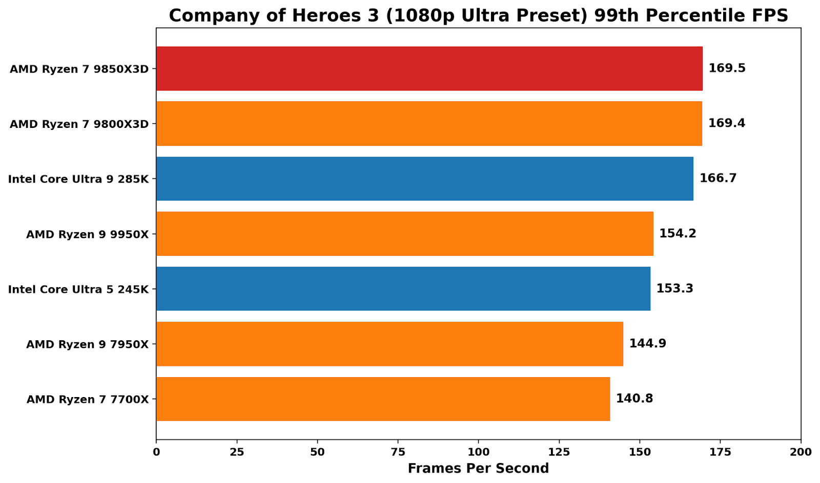 In Company of Heroes 3, the cache-laden X3D chips win out here, although just marginally over Intel’s flagship Core Ultra 9 285K. The difference between the X3D chips is marginal (0.3%), indicating that the extra core speed doesn’t deliver meaningful performance gains here.