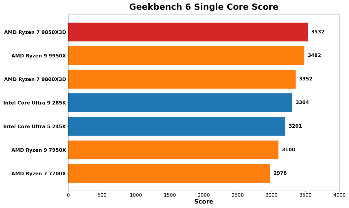 Geekbench multi-core brings things back to the expected hierarchy of multi-threaded performance: AMD’s Ryzen 9 9950X wins out, Intel’s Core Ultra 9 285K comes in second by around 3%, but the real takeaway here is that the Ryzen 7 X3D pairing (9850/9800X3D) is effectively tied. There’s a noticeable uplift over the Zen 4 8C/16T 7700X, which is expected given the generational gains from Zen 4 to Zen 5.