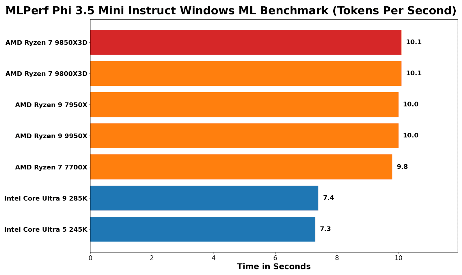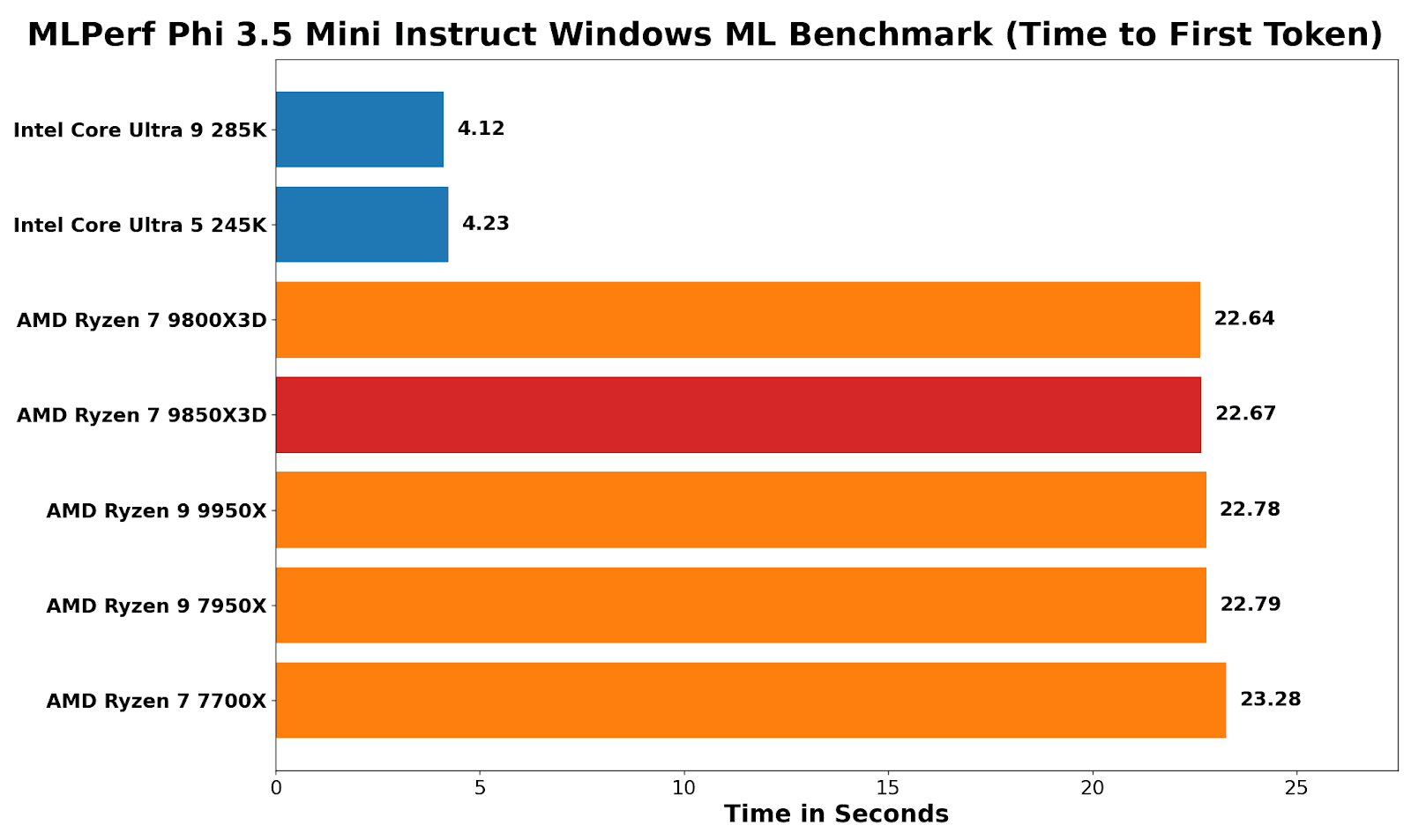 Looking at MLPerf and using the Phi 3.5 Windows ML benchmark, the clear benefit of Intel’s NPU in the Core Ultra (Arrow Lake) series of processors is evident: time to first token is around 5.4x faster than on every AMD chip tested. This is because the NPU can be used here – AMD only has the integrated graphics.