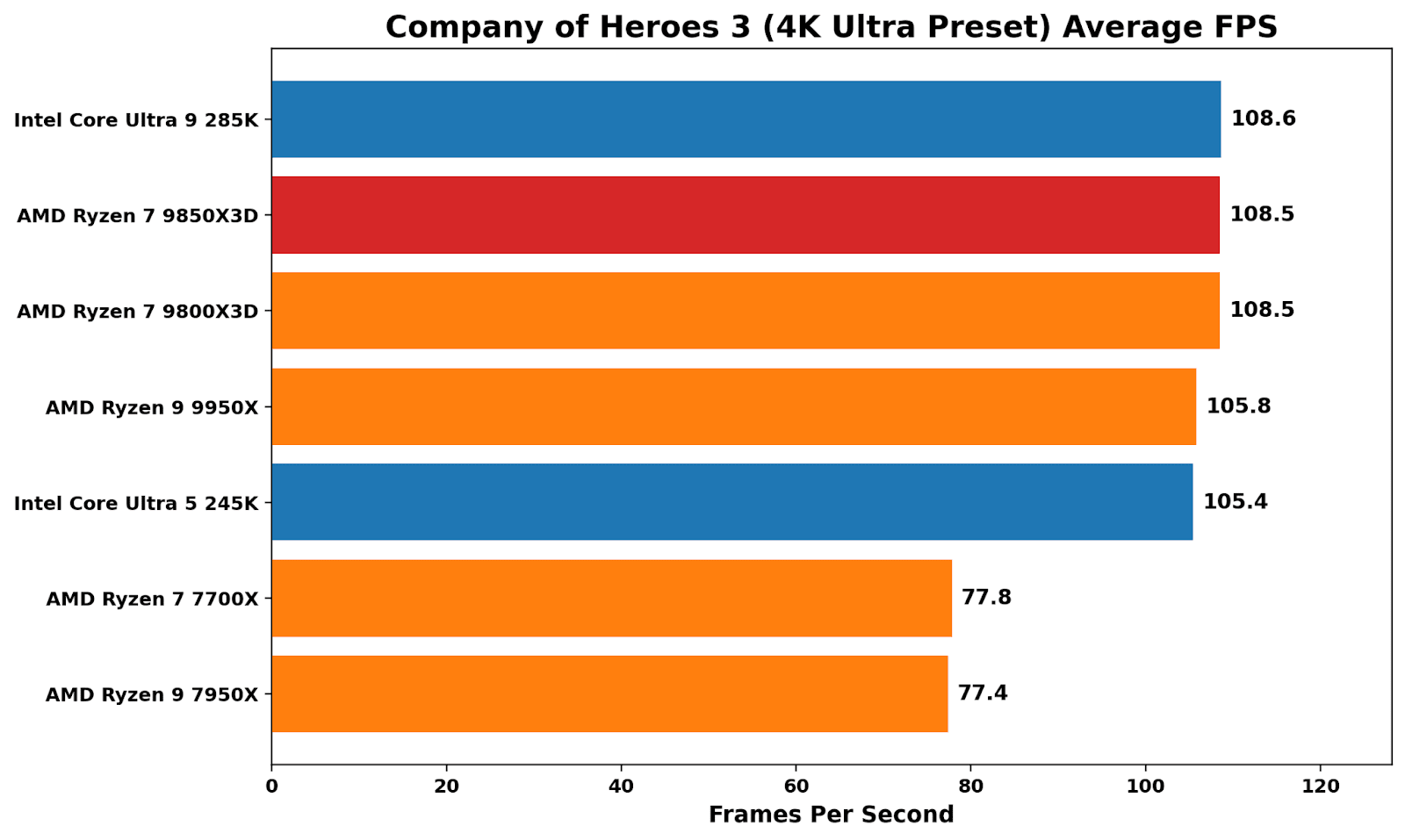 At 4K ultra, Company of Heroes 3 is generally GPU-limited, although there is a noticeable performance uplift from Zen 4 to Zen 5.